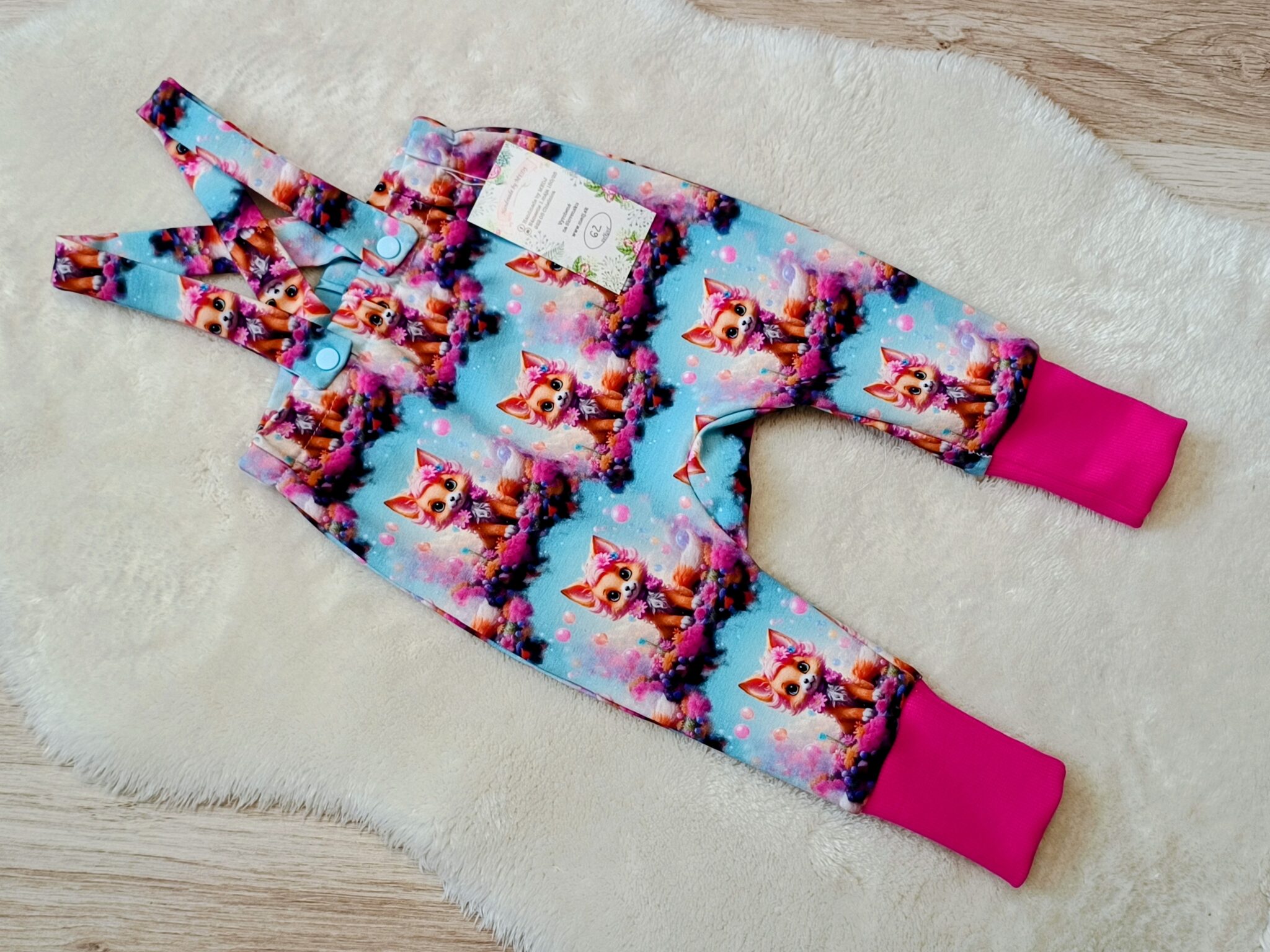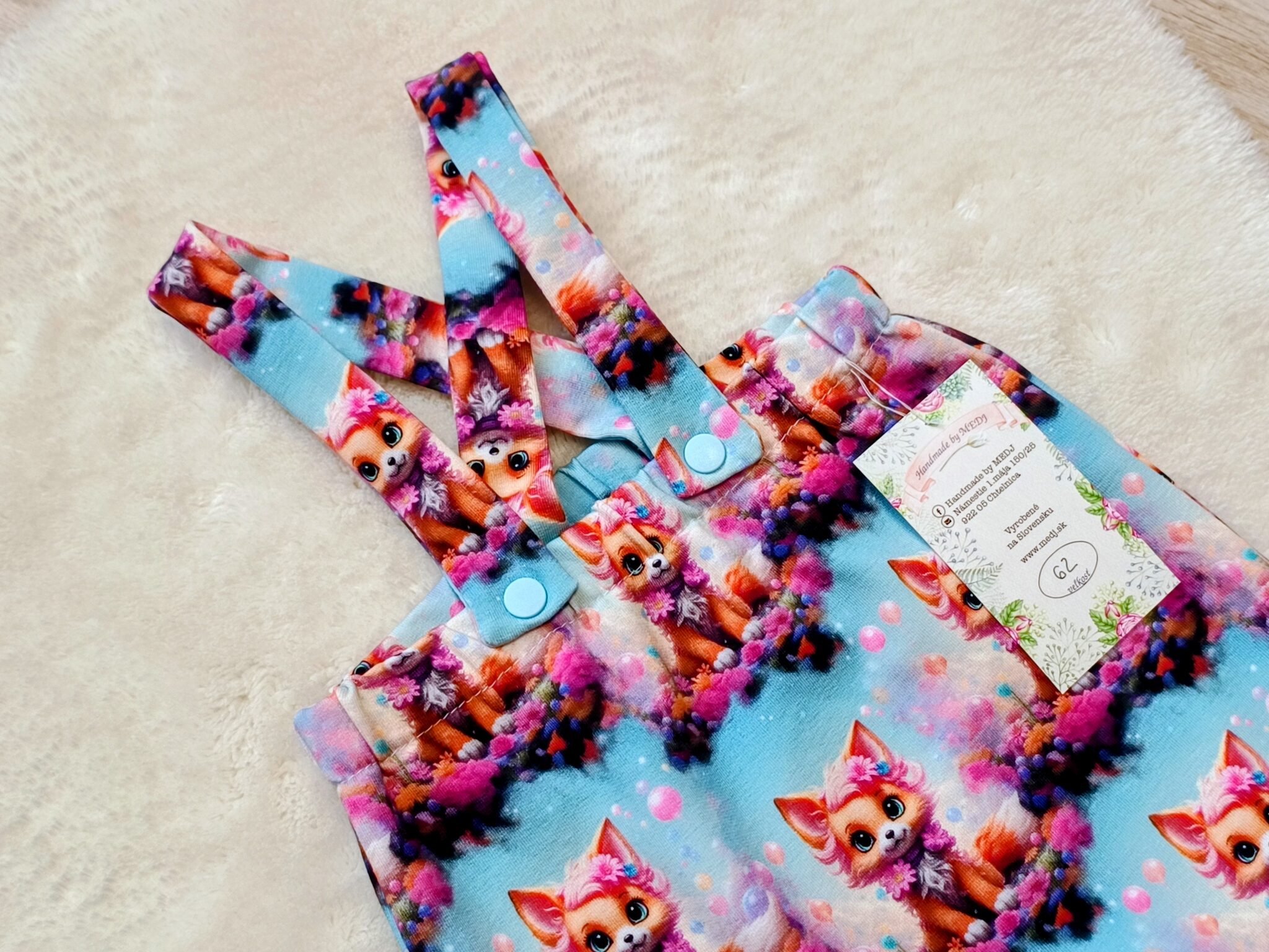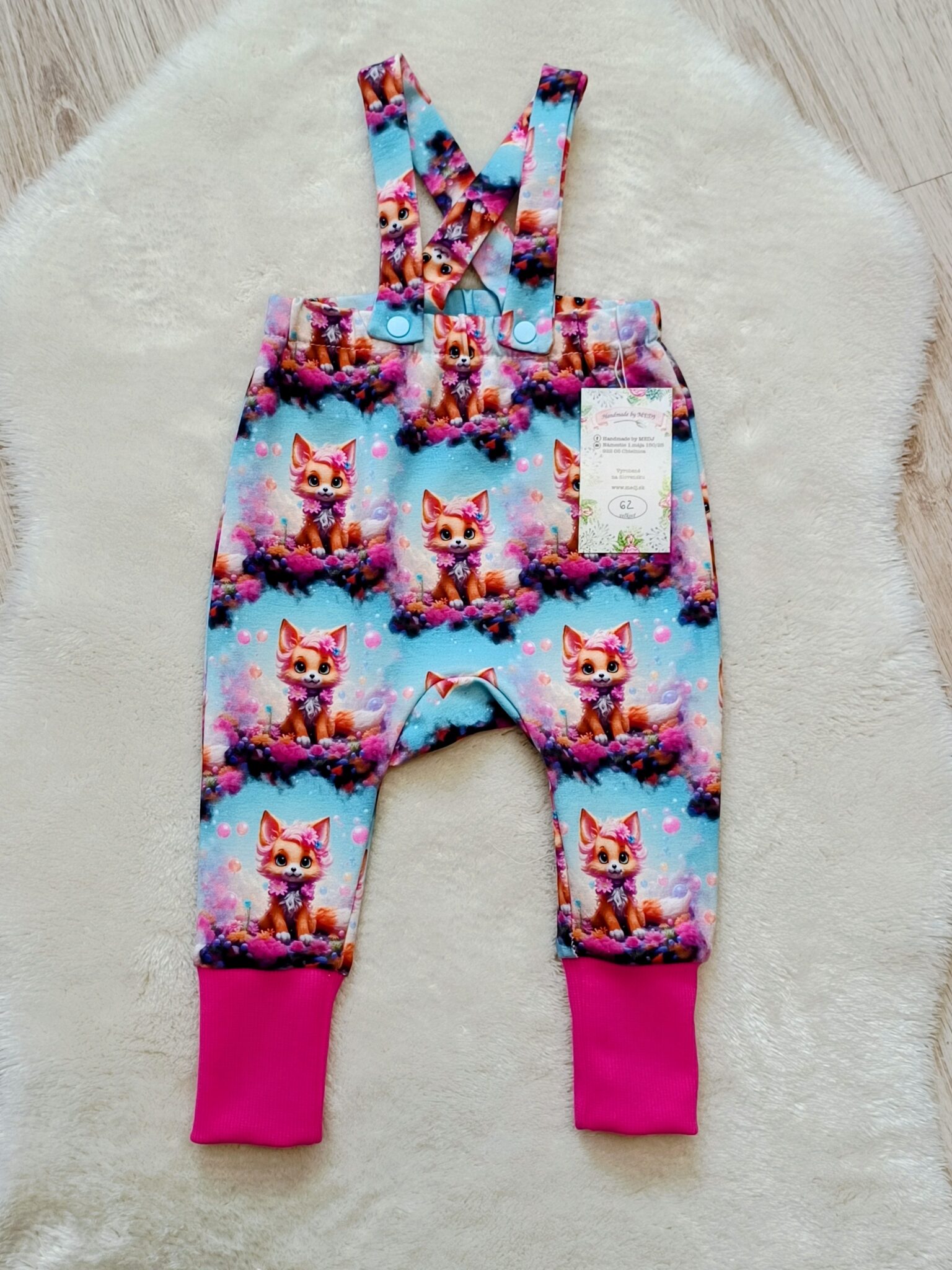 Trakáče sú šité z kvalitnej teplakoviny 95%bavlna a 5%elastan. Majú rastúce patenty.Traky je možné vzadu dať rovno ale aj prekrížit. V predu majú traky zapínanie na trukle.